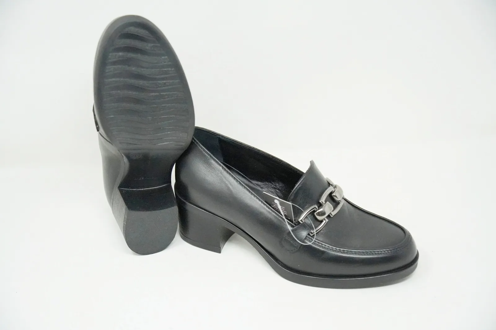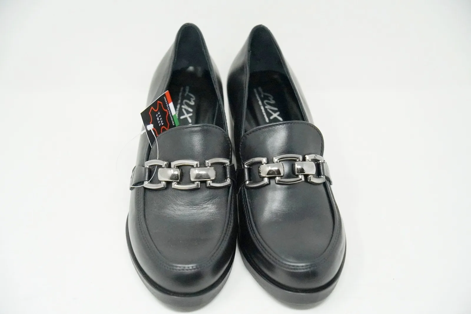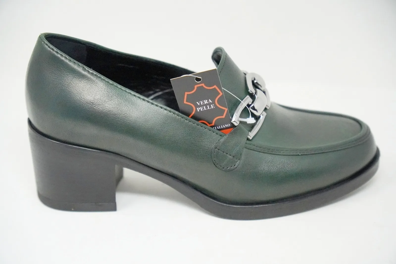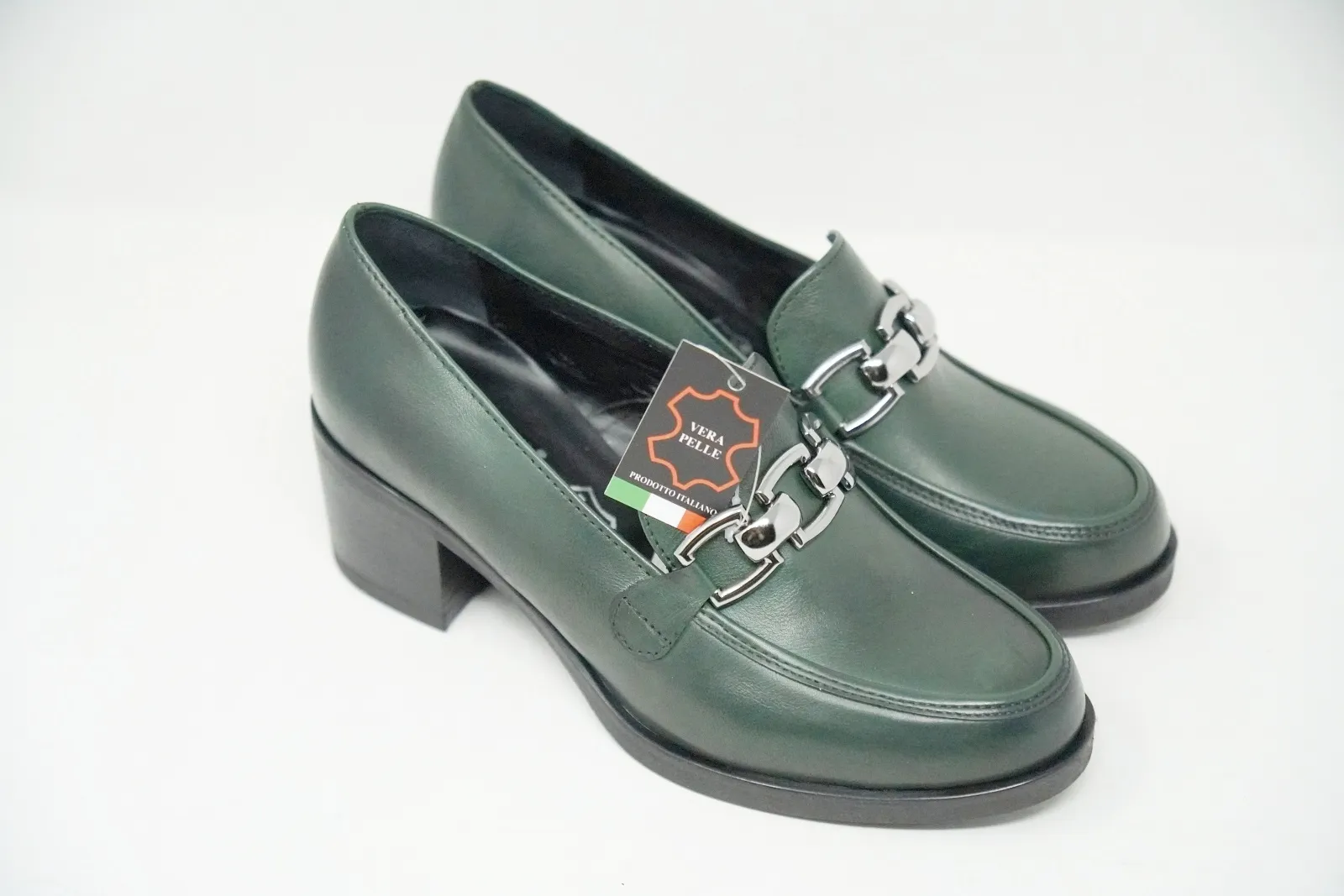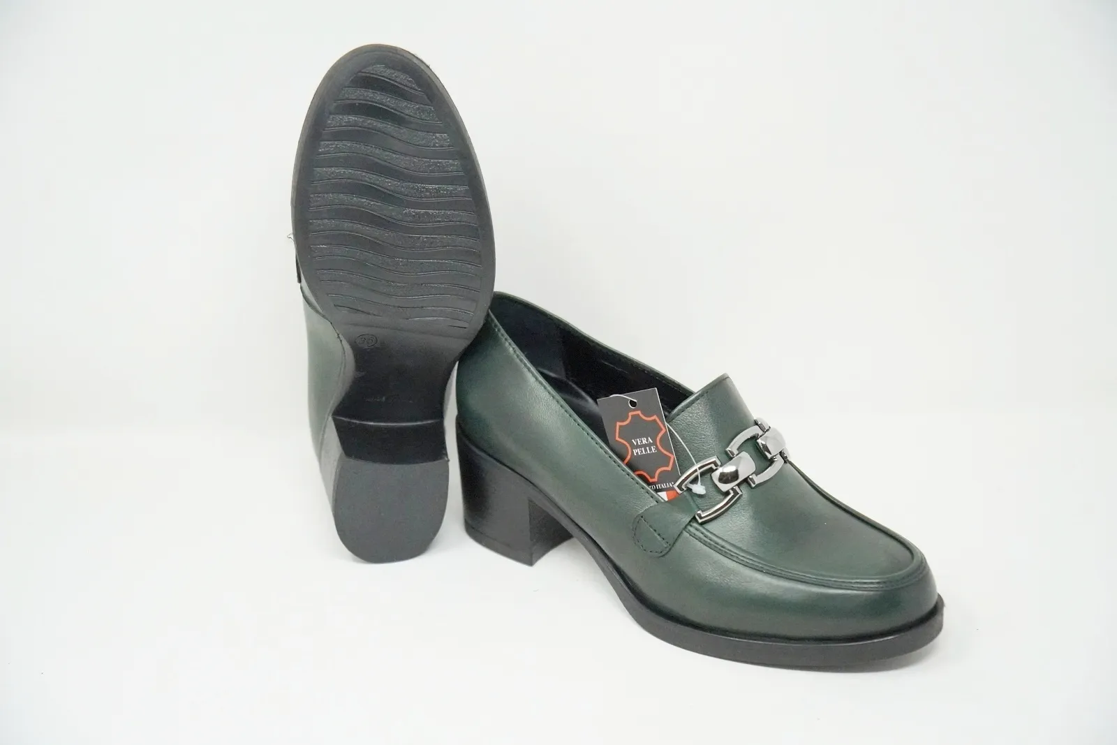 La tomaia è realizzata in pregiata pelle, mentre la suola è in gomma con un tacco di 5 cm.