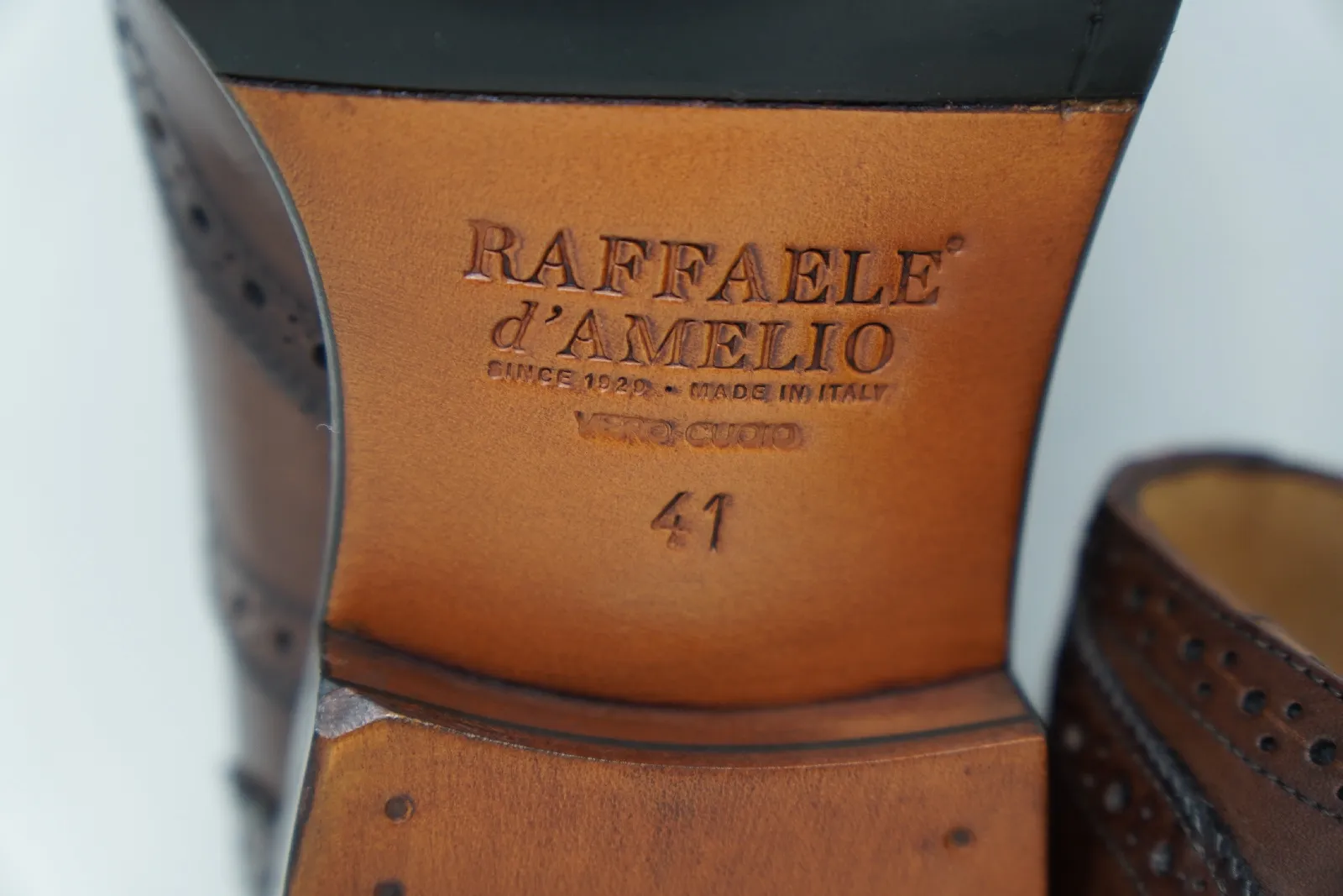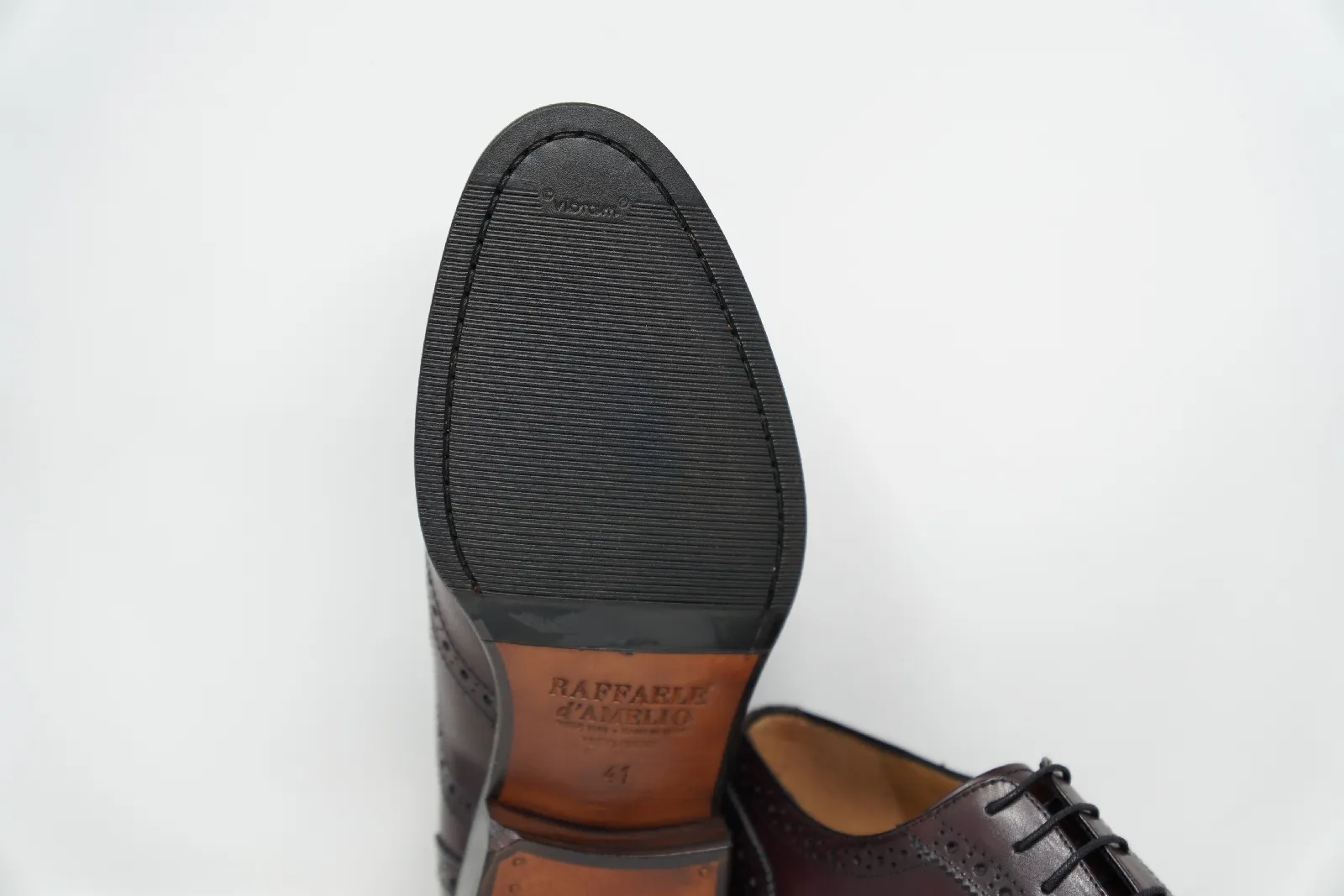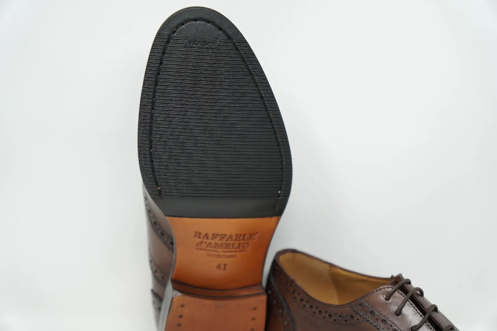 La tomaia è in pregiata pelle di vitello come la fodera mentre la suola è in vero cuoio con la mezza gomma Vibram, il tutto cucito insieme.